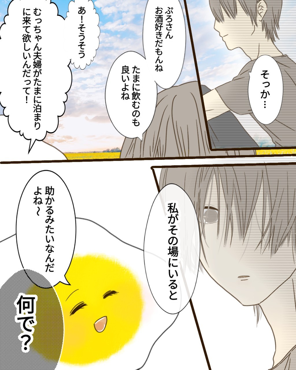 ぷろさんを、間に挟む癒し系の置き物みたいに「助かる~」なんて言うむっちゃん夫婦にもだろうし、ぷろさんにも「また利用されてるじゃない😠」と、ちょっと怒っていたのでは?
