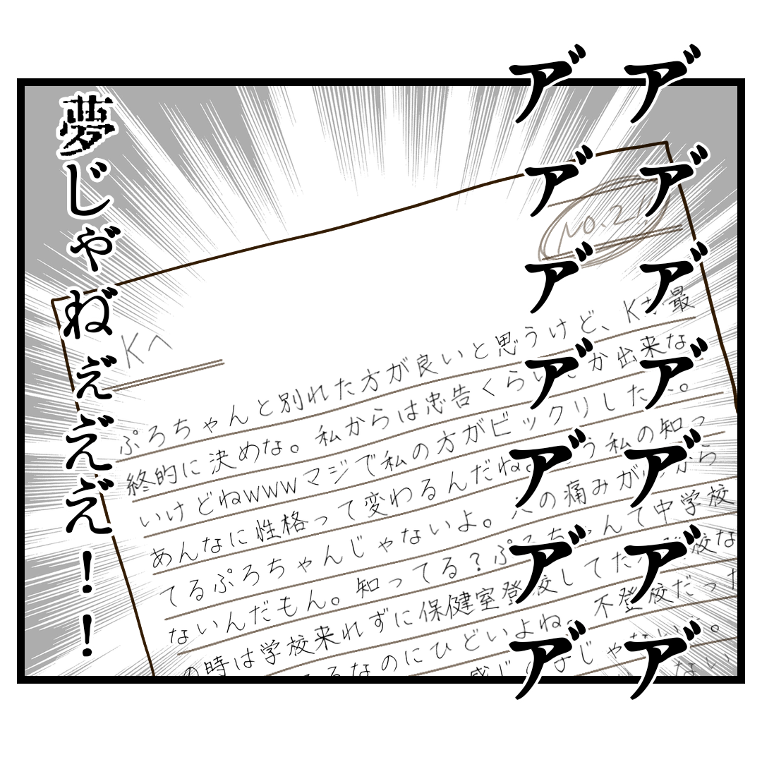 そんな手紙をわざわざぷろさんが自ら彼に渡すようにお願いしたり周りを巻き込んでハブろうとしたり…こんなやつそもそも友達でも何でもなかったんじゃない?と思います。