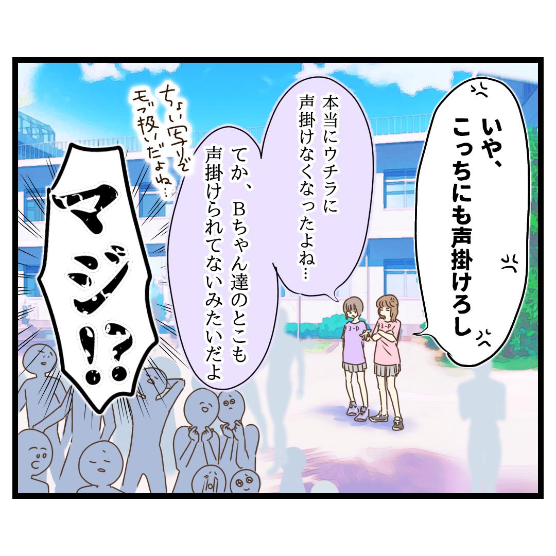 いじめた側がいじめられる側になる。これは良くあるパティンソンですが、Bちゃん達は複数で行動しているから、そのグループの中で自分達が悪いと感じていても言い出せない空気になってたんじゃないかなーと思います。もし、言い出したとして、グループからハブられて、他に助けを求めても今更とハブられる。一人になる。見えない未来に怯えて、必死に、自分の居場所を守ろうとしてたんじゃないかな。何の意味も無いのに。